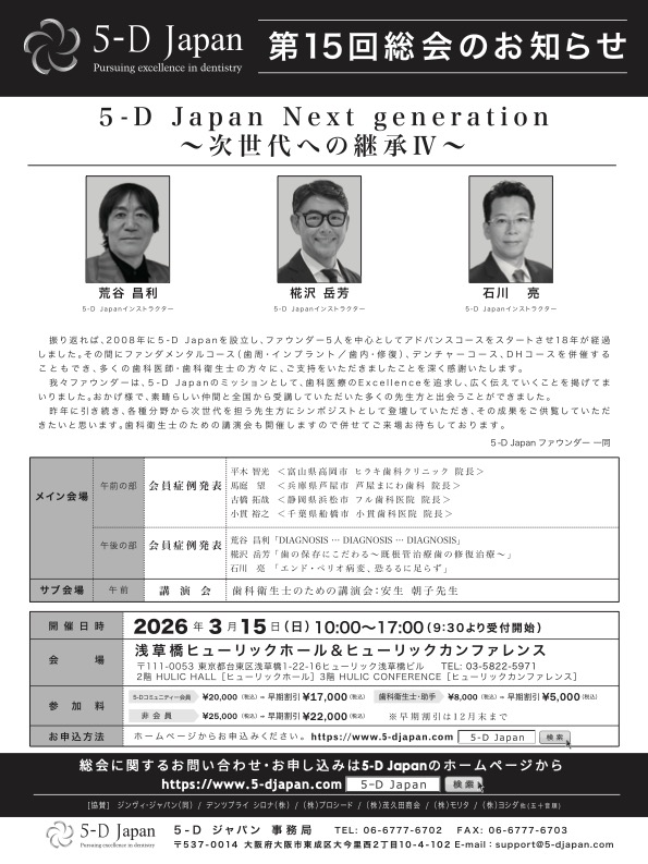 | 参加料 | 【5-D コミュニティー会員】¥20,000(税込)→早期割引¥17,000(税込) 【非会員 歯科医師】¥25,000(税込)→早期割引¥22,000(税込) 【歯科衛生士・助手】¥8,000(税込)→早期割引¥5,000(税込) ※早期割引は12月末まで |